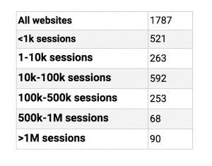 To see how accurate the data from SW is for websites of different sizes, we decided to segment them in 5 different groups, based on how many monthly sessions GA reports a website has.